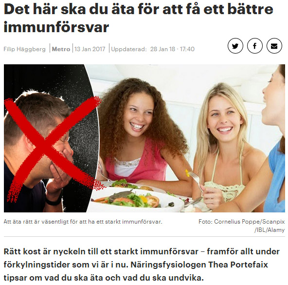 – Oftast är det inte fel på maten vi äter, utan hur vi tillagar den. När vi äter dålig mat slösar kroppen energi på att bryta ned den, energi som egentligen behöver användas till att stärka immunförsvaret, säger Thea Portefaix.- Det här ska du äta för att få ett bättre immunförsvar, Metro 28 januari 2018