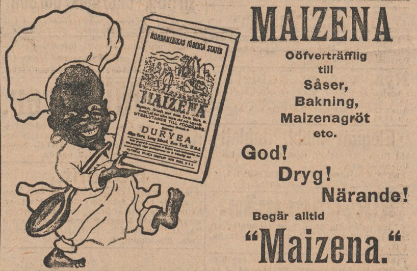 Det var inga problem att hitta belägg för missuppfattningen maizena/majsmjöl även från folk som verkligen borde veta bättre. Annons från 1919.